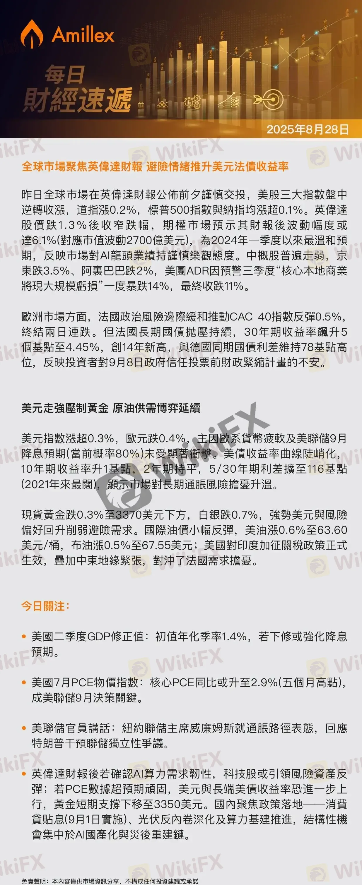 Amillex每日匯評:全球市場聚焦英偉達財報 避險情緒推升美元法債收益率