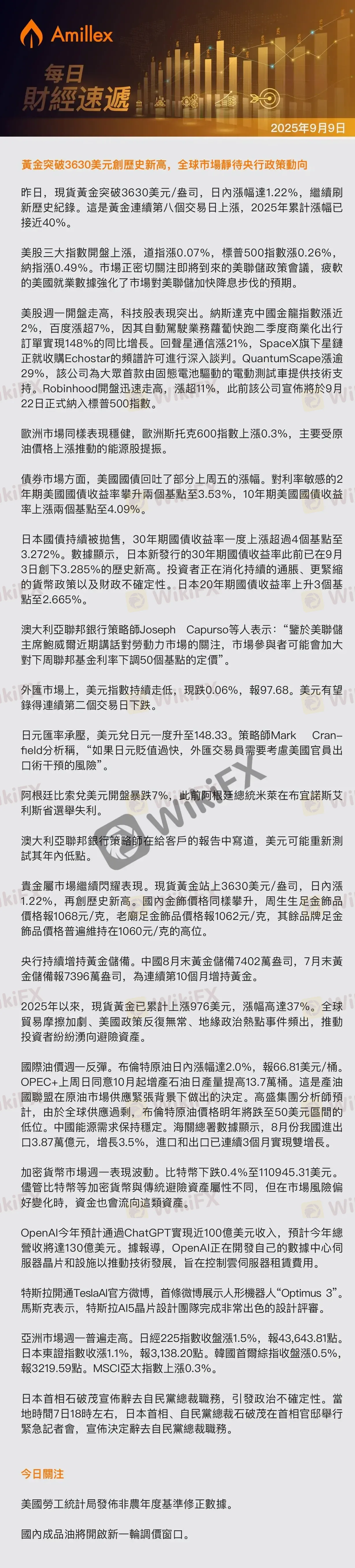 Amillex每日匯評:黃金突破3630美元創歷史新高,全球市場靜待央行政策動向