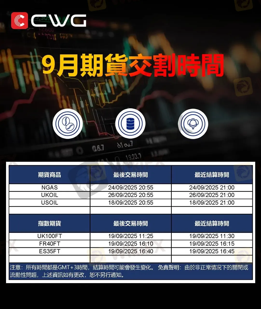 CWG MARKETS -九月期貨結算時間安排表