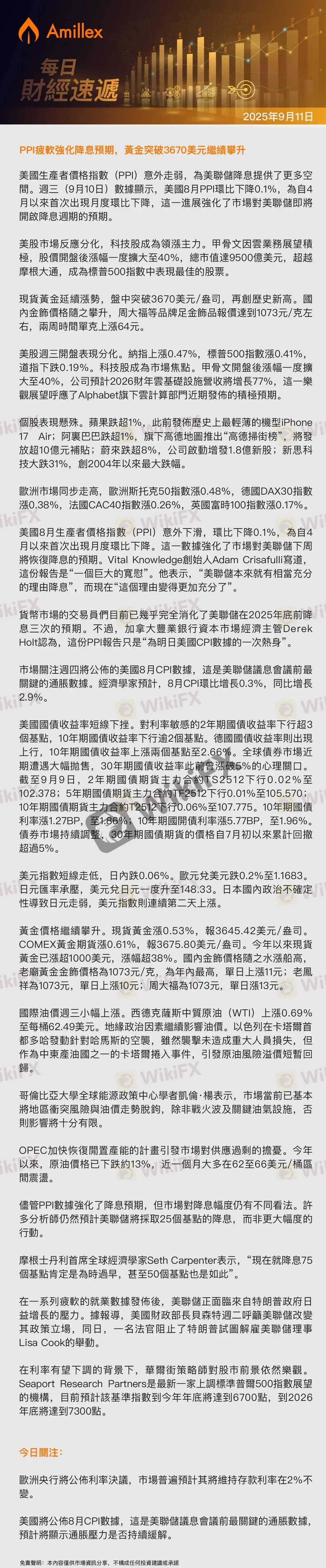 Amillex每日匯評:PPI疲軟強化降息預期,黃金突破3670美元繼續攀升