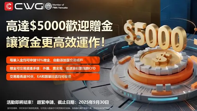 立即參與CWG的10%歡迎贈金活動,每筆入金都能獲得最高$5000的贈金,為您的交易提供更強大的資金支持!🎉
