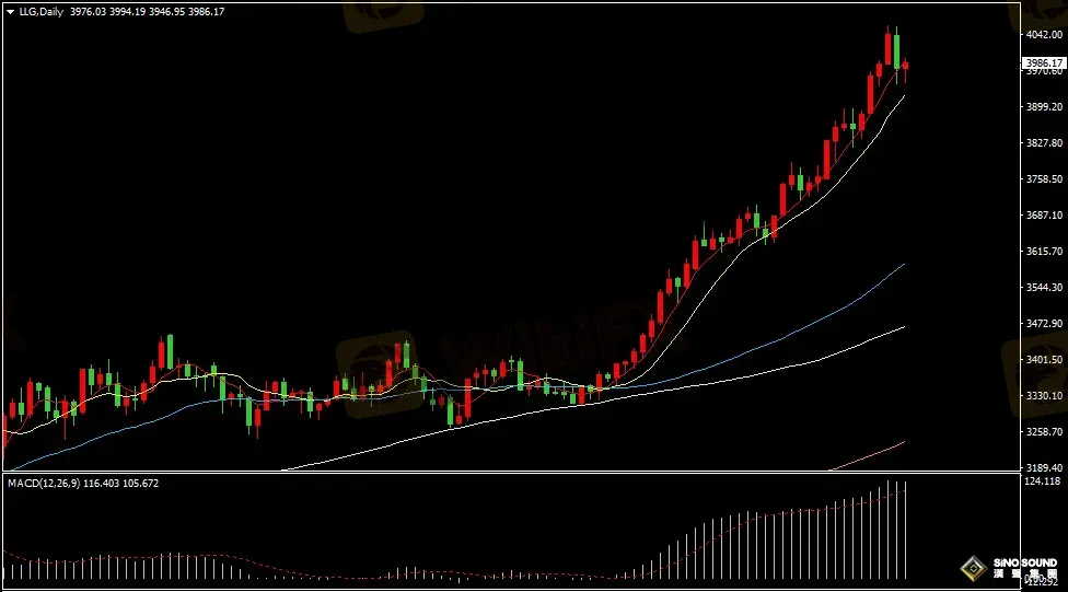 金價日線圖看,昨晚金價大幅回落後並跌破4000美元關口,今日金價最低在3946美元附近,最高在3994美元附近,目前金價持續在5日均線附近振盪運行。指標看,金價在5日和10日均線維持多頭排列,MACD指標正動能柱持續高量運行,RSI指標持續在75位置附近徘徊。