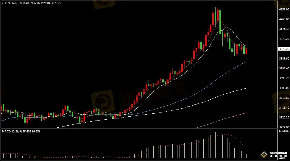 金價日線圖看,日內金價振盪回升最高觸及5日均線附近,目前金價仍然處在5日和10日均線下方。由於今晚公佈“小非農”數據,估計屆時金價將會大幅波動,關注金價上攻3988美元和4005美元突破能力,下方支撐關注3925美元、3900美元或3885美元附近;指標看,5日與10日維持空頭排列,MACD指標正動能柱持續減少,RSI指標回升至49位置附近運行。