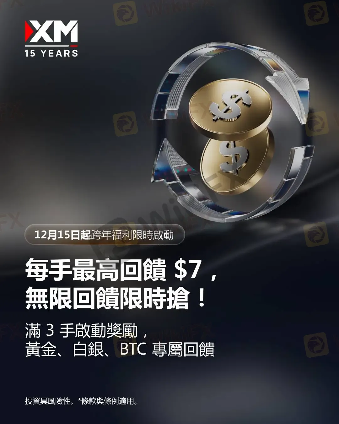 為年末交易注入活力,XM 歡慶15週年帶來全球限時福利——交易黃金、白銀、BTC,自第 3 手開始享獎勵,最高每手 $7 現金回饋無上限!