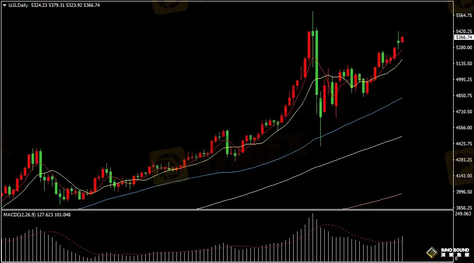 金價日線圖看,昨日金價大幅沖高後回落,顯示金價在5418美元附近存在一定阻力壓制,但金價回落後重新上漲並保持在前期震盪區域上方,表明短期內金價上漲趨勢仍然持續。日線指標看,5日均線與10日均線持續形成多頭向上,MACD指標正動能柱持續增加,RSI指標在64位置附近運行。